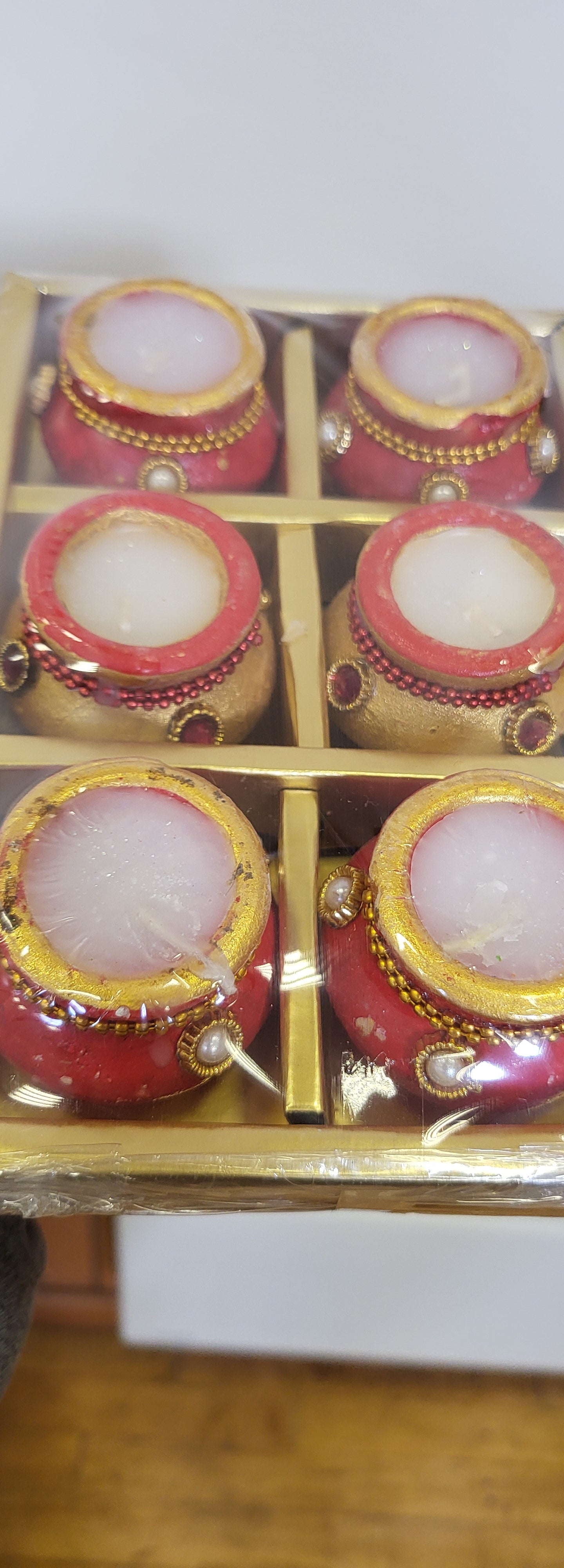 Diwali White Pearl and thread Diwali Red and golden Diya Clay Matki Diva Wax Candle Indian Lamp Pooja Hindu Festival Gift 6pc gift set